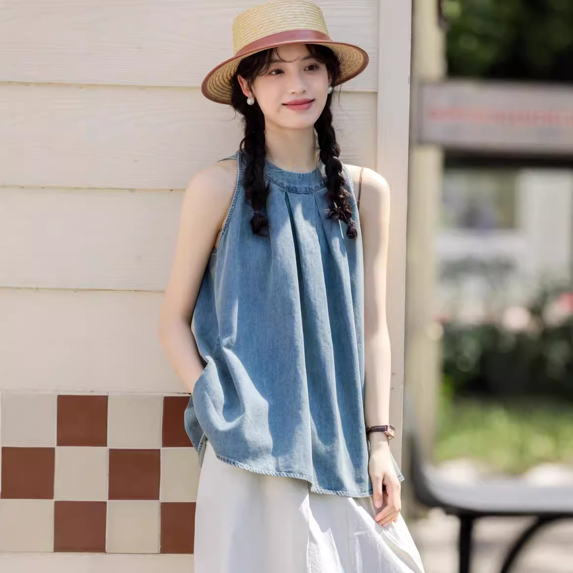 夏純色壓褶掛脖無袖牛仔上衣