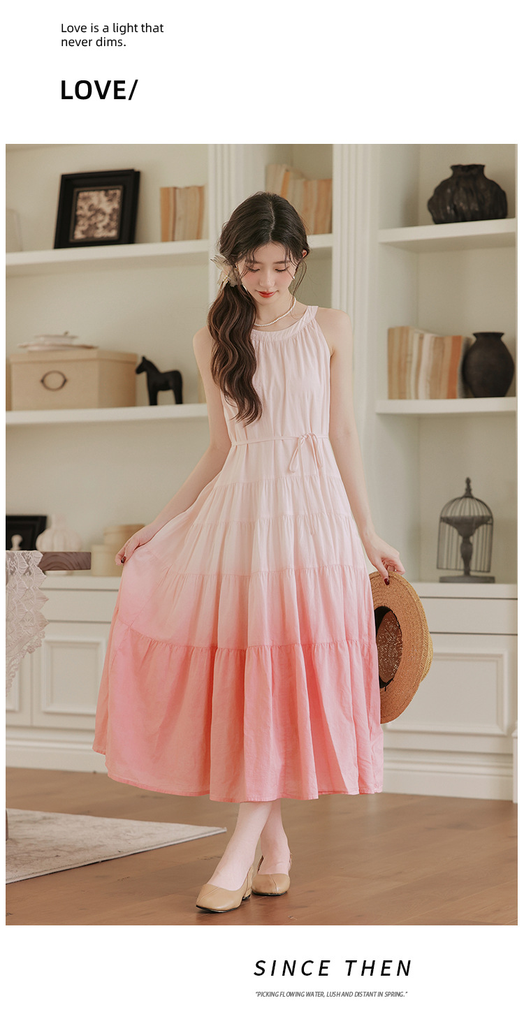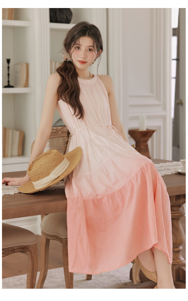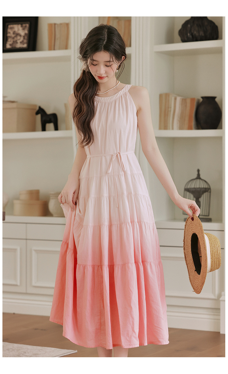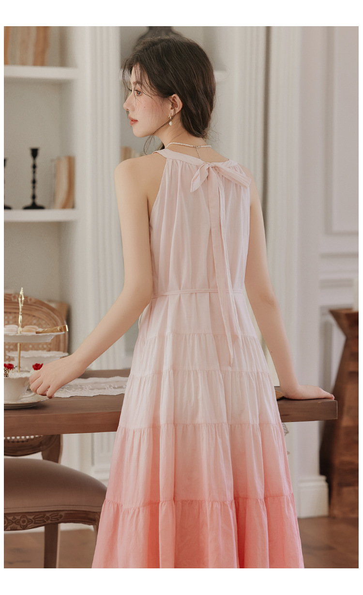 夏漸變粉無袖蝴蝶繫帶連衣裙子