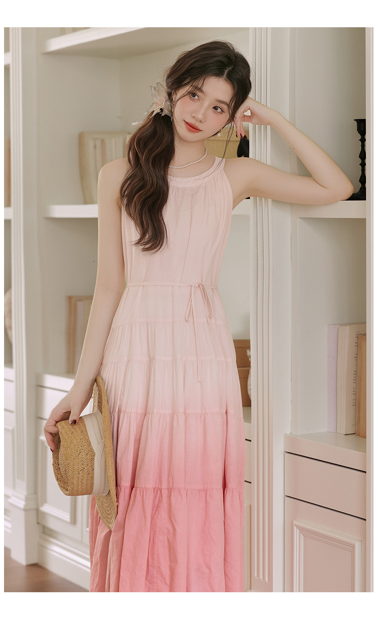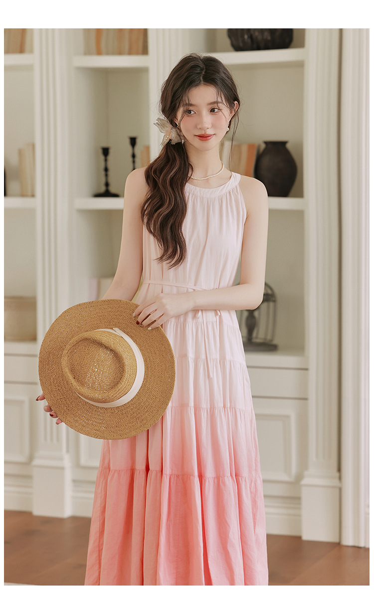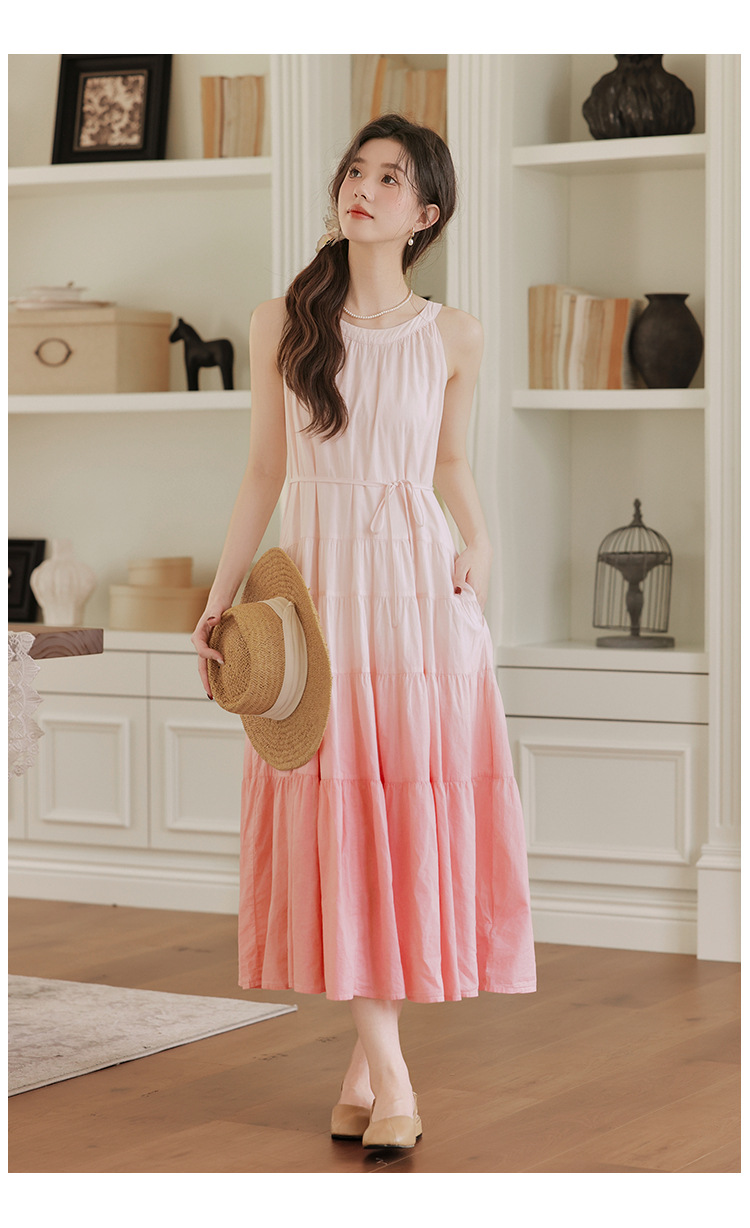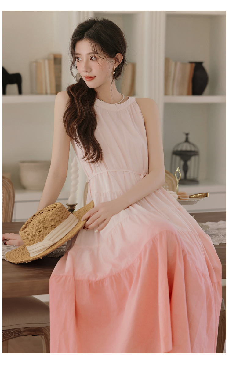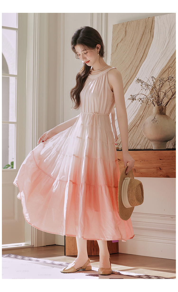 夏漸變粉無袖蝴蝶繫帶連衣裙子