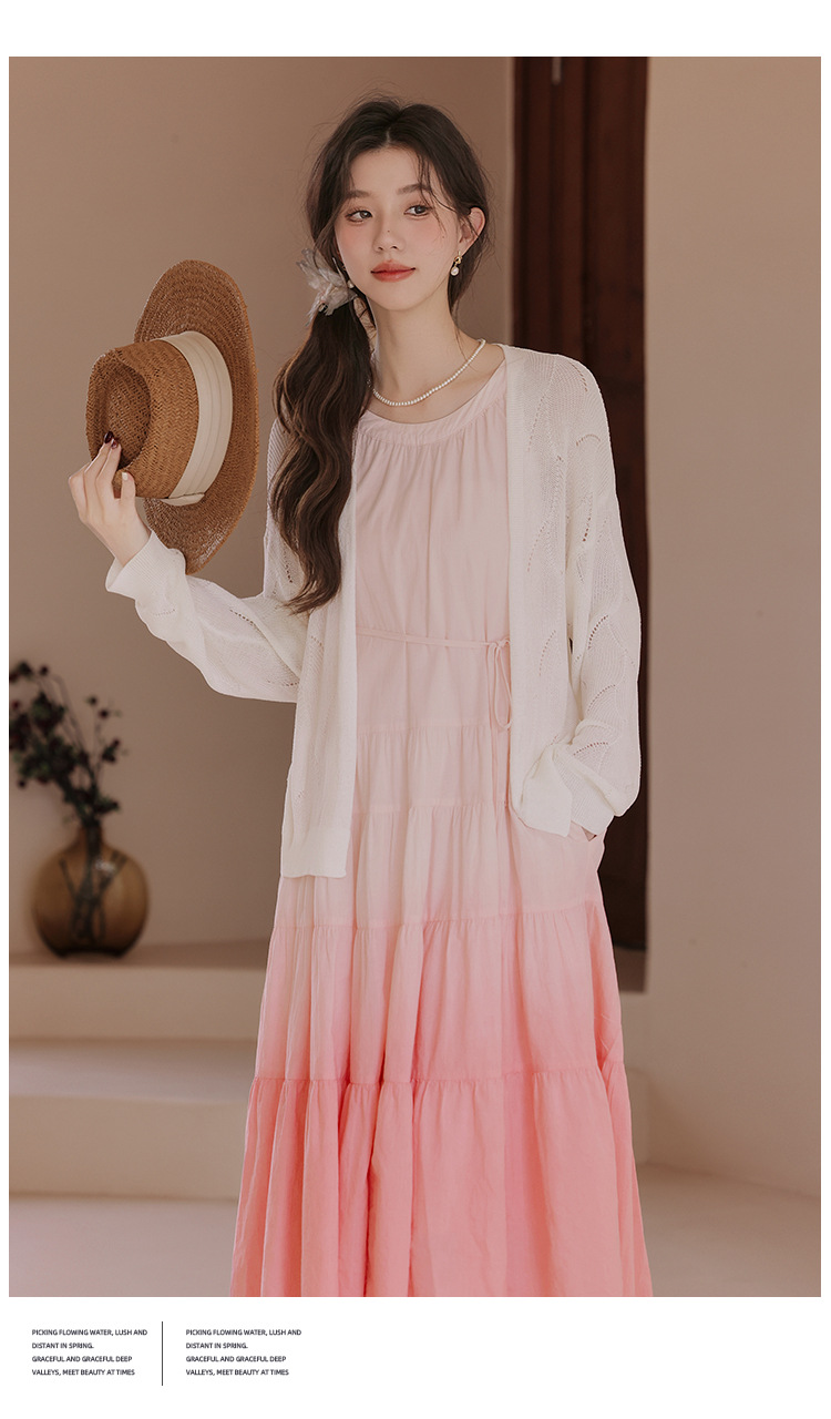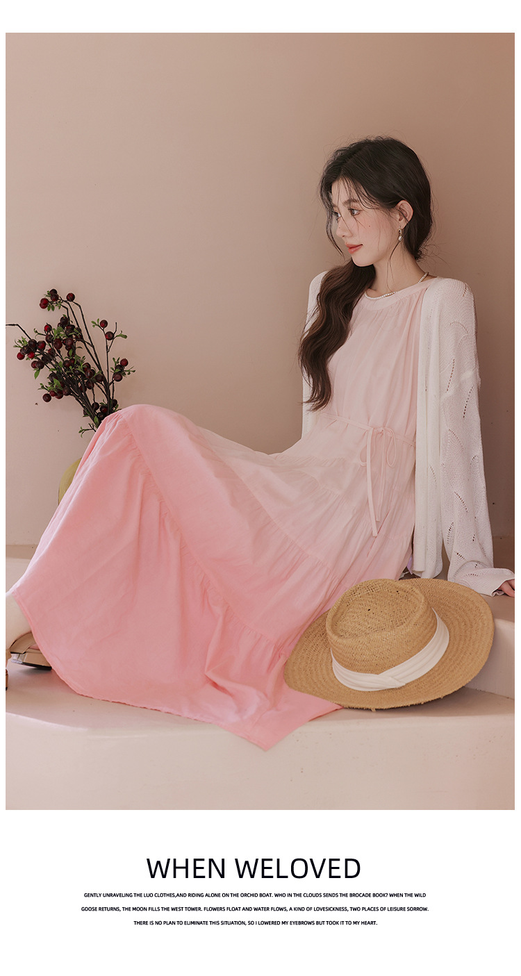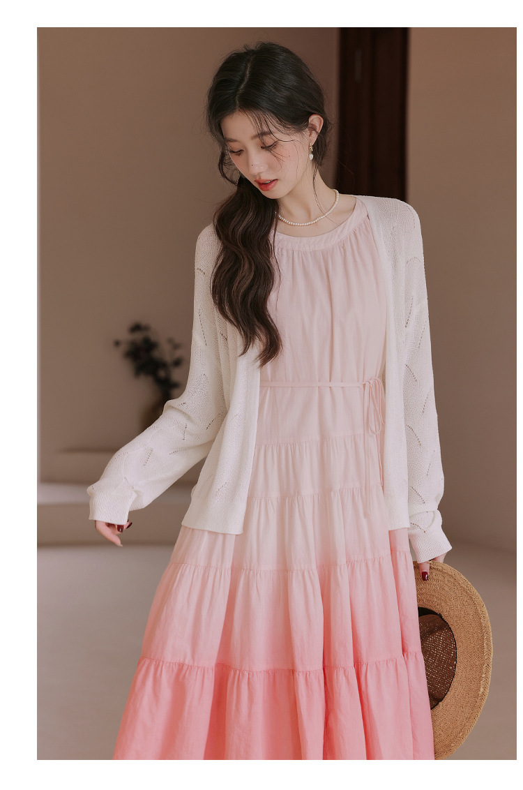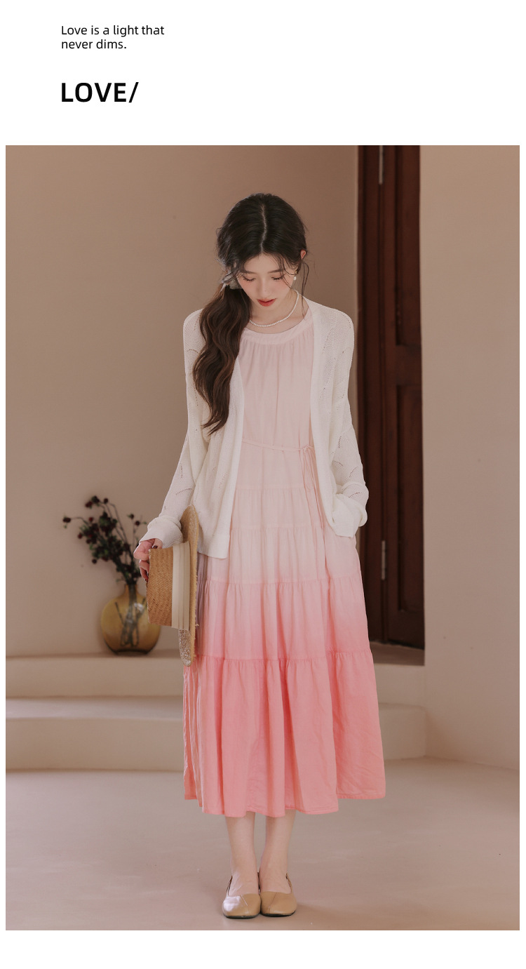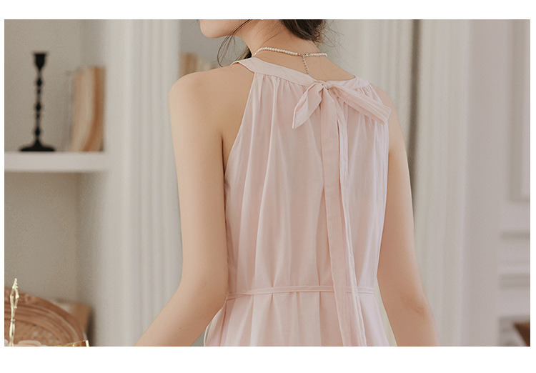 夏漸變粉無袖蝴蝶繫帶連衣裙子