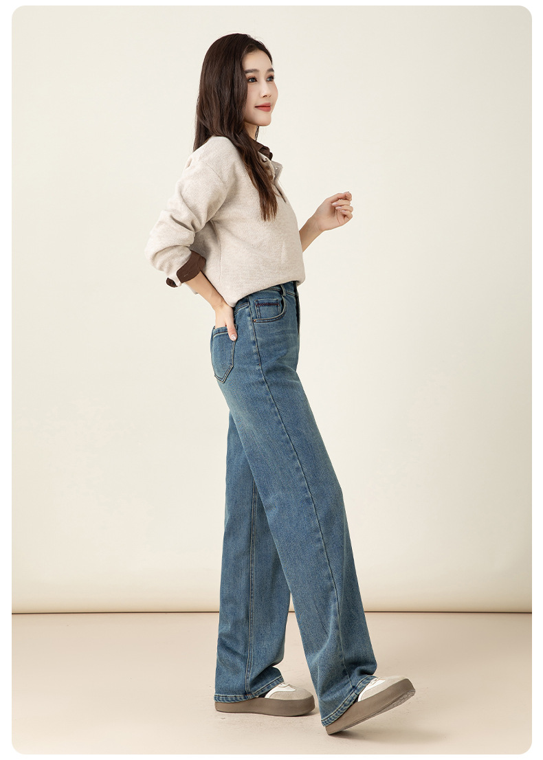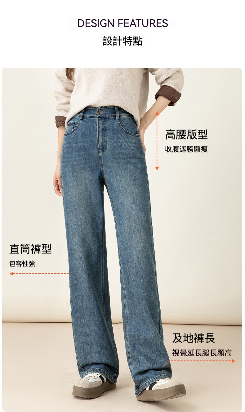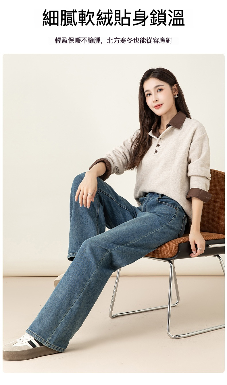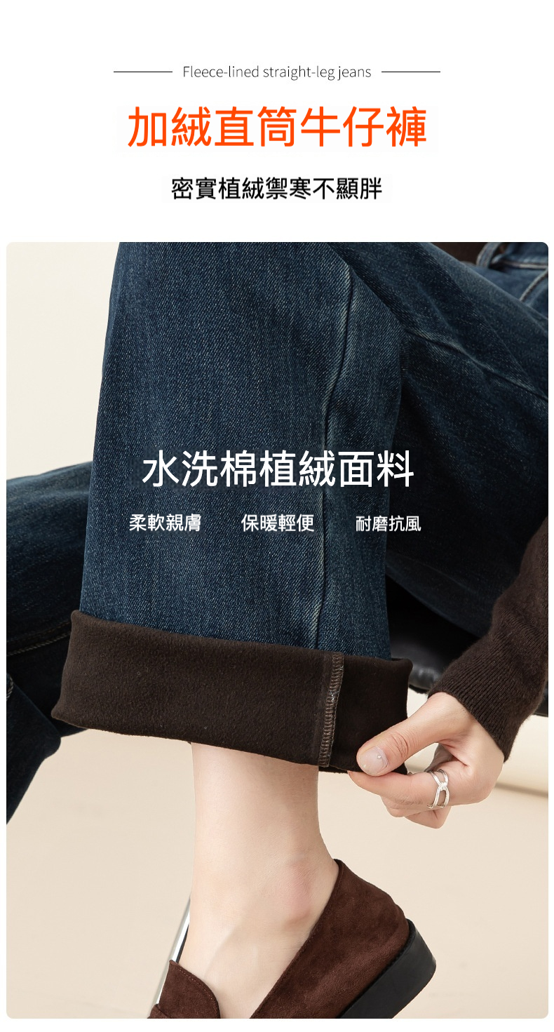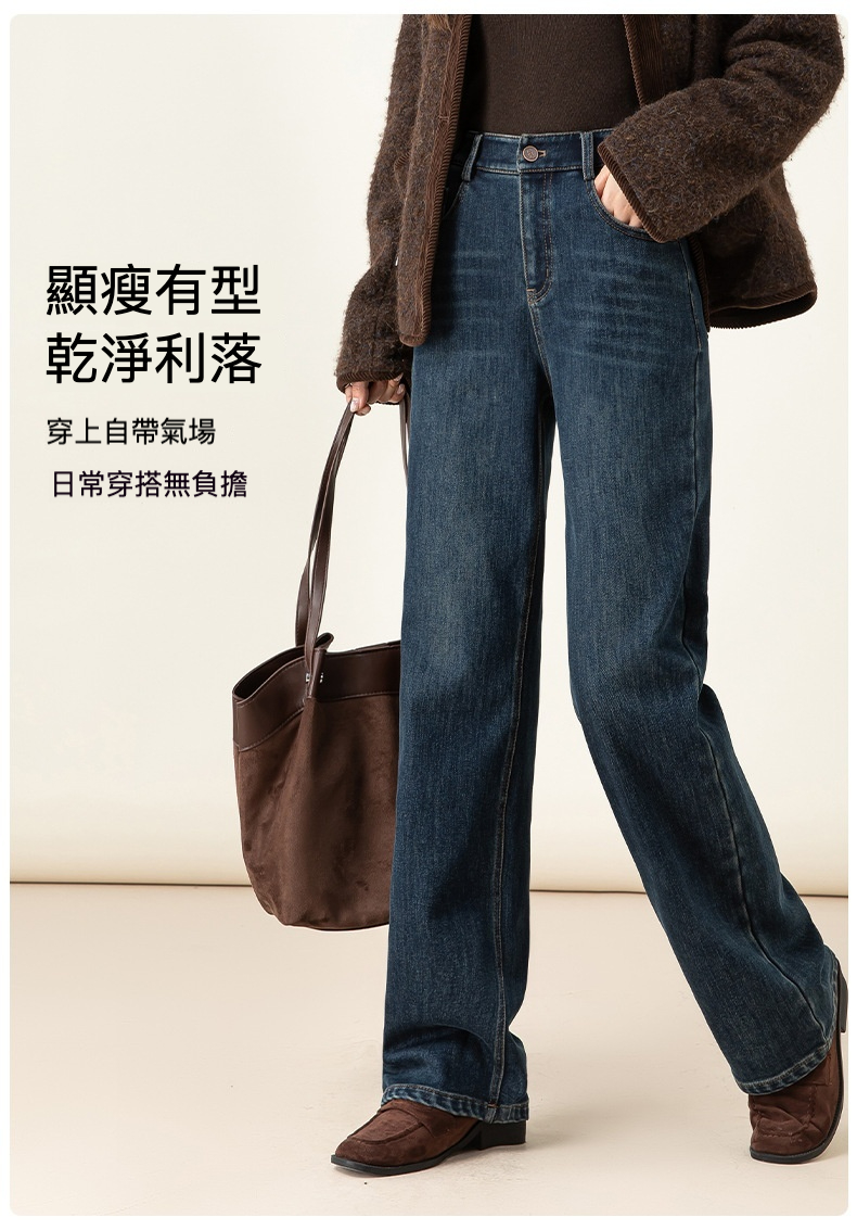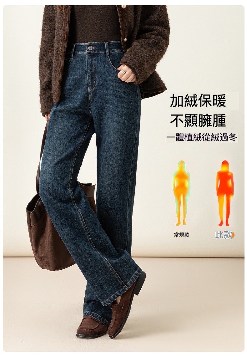 女士冬季加絨高腰直筒牛仔褲