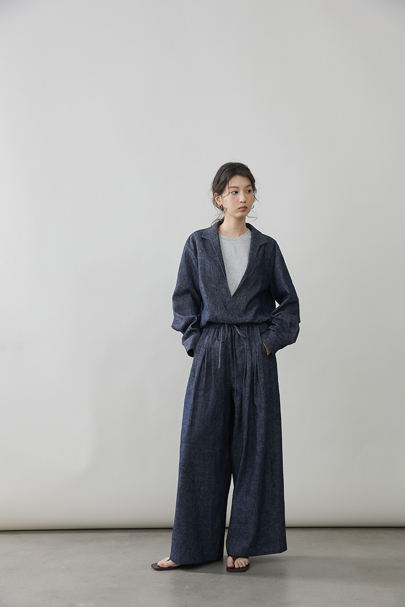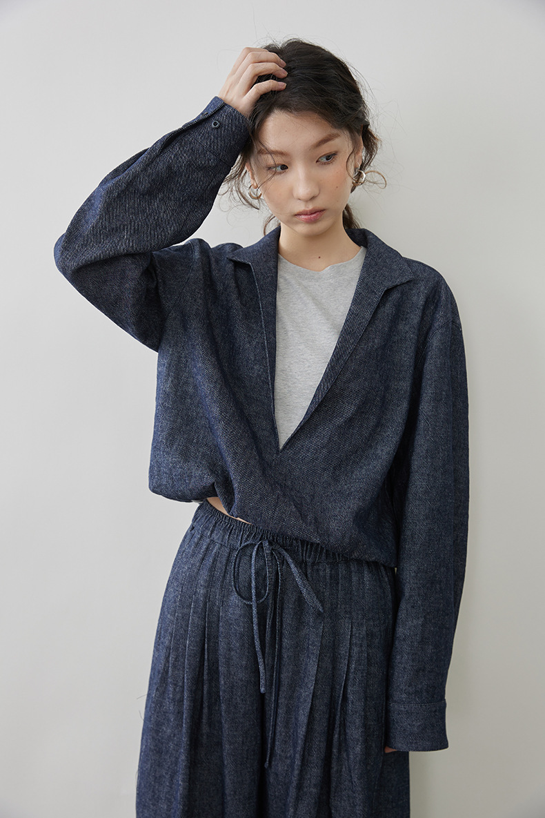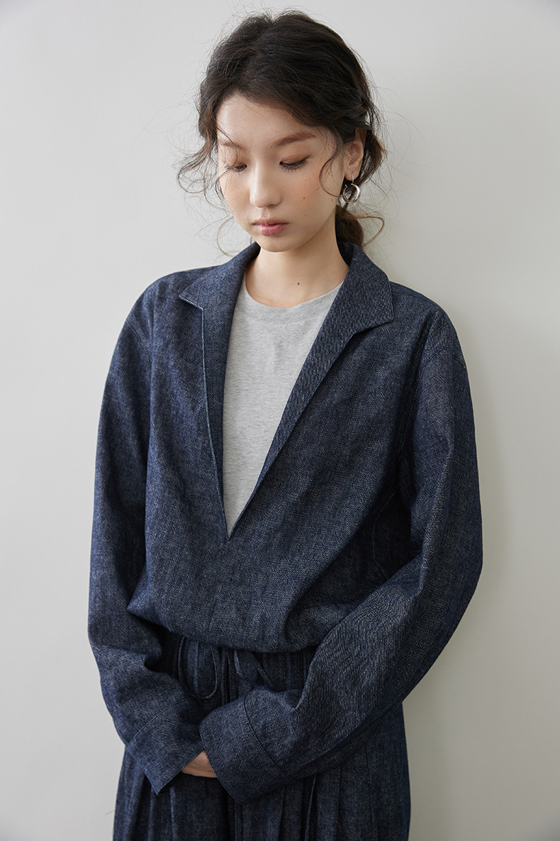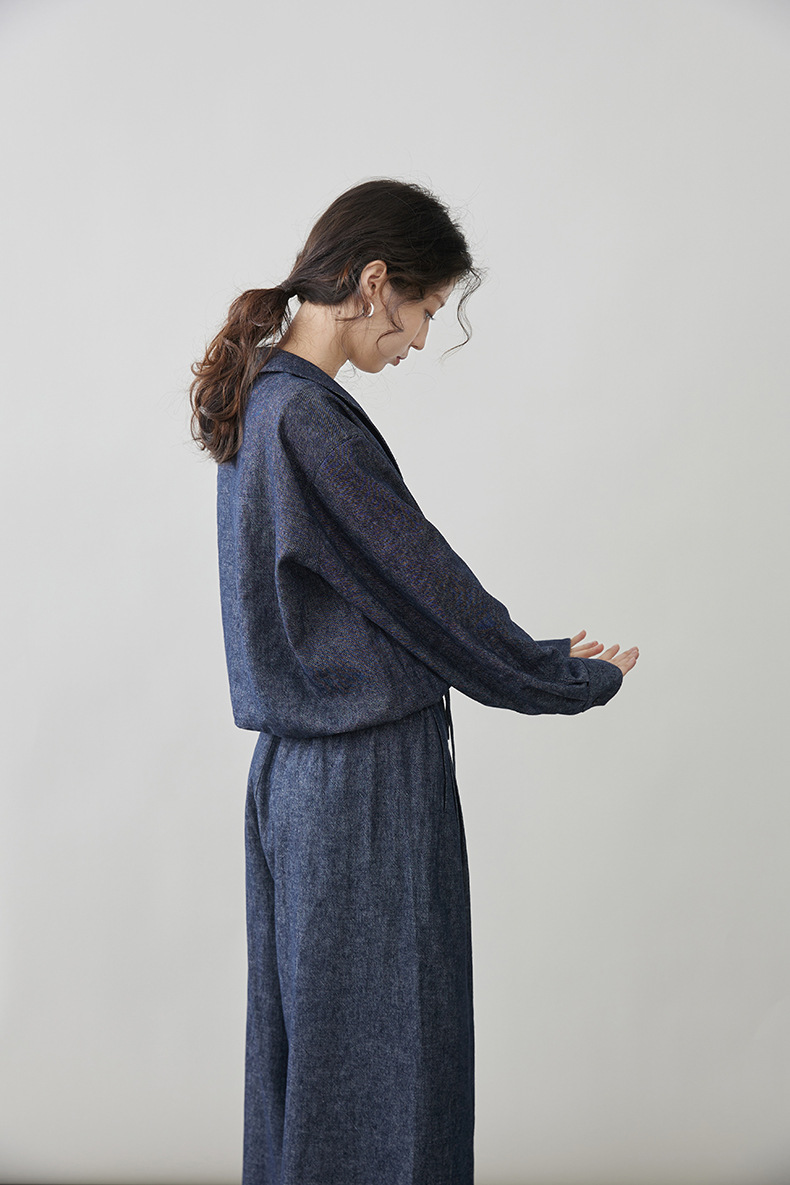女士春秋亞麻棉牛仔假兩件套裝