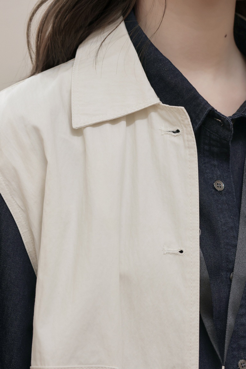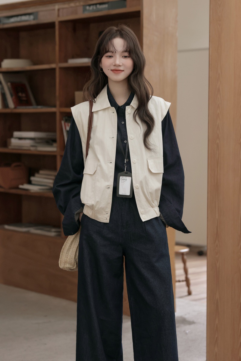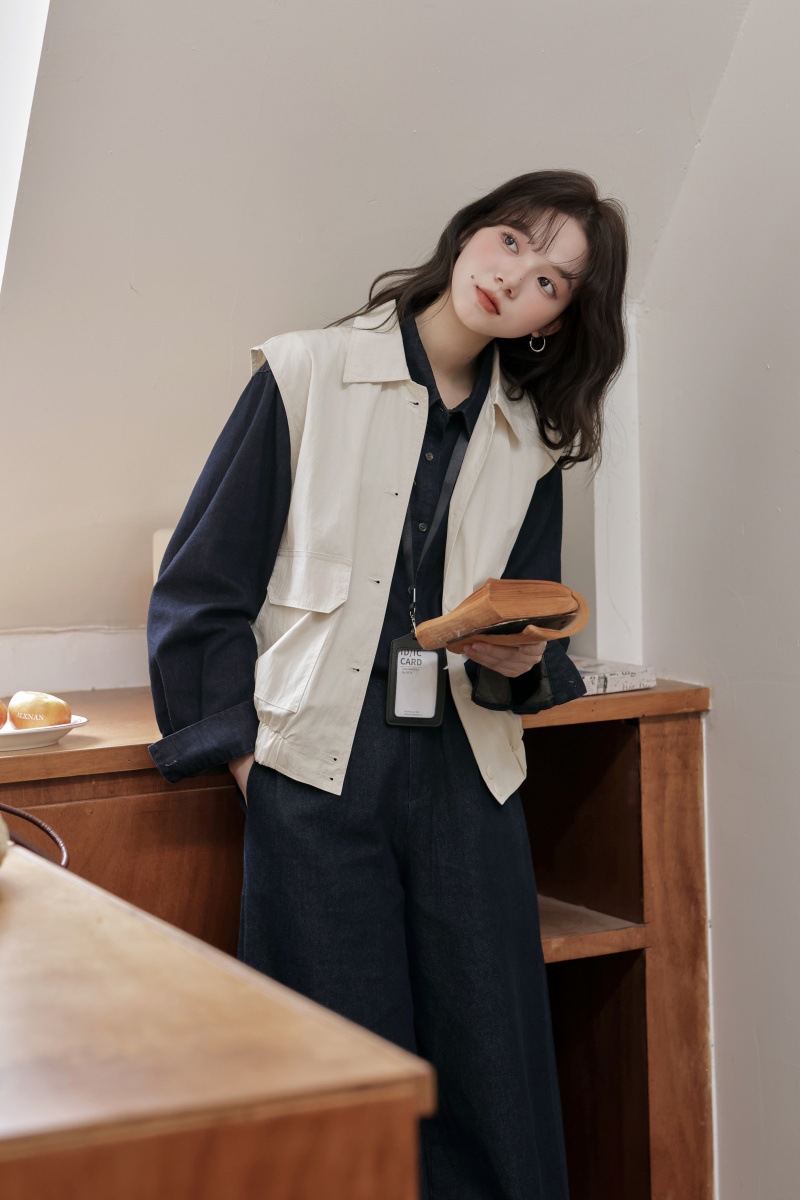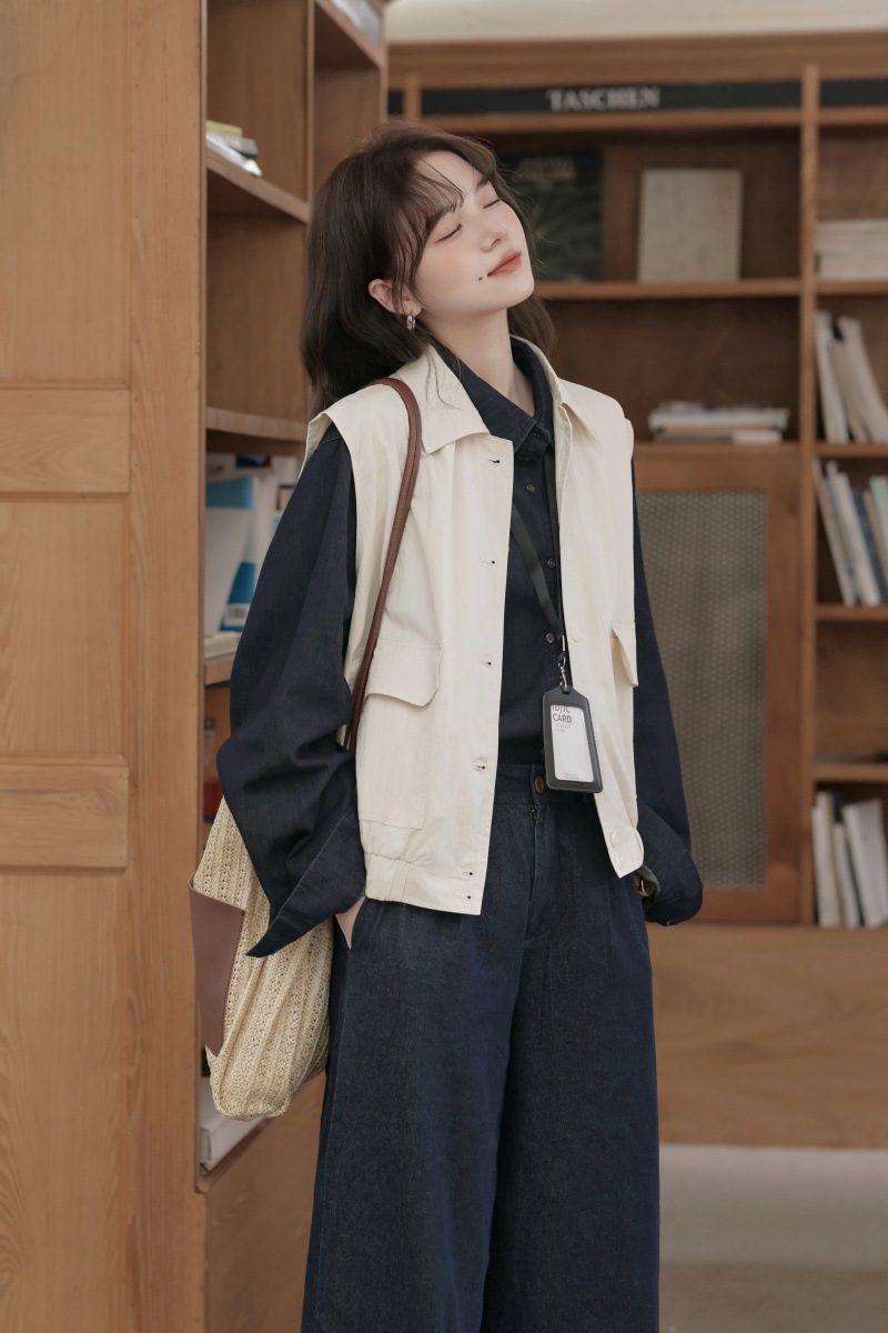 女士春秋大口袋工裝米白色馬甲+藏青色襯衫