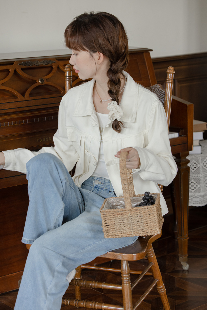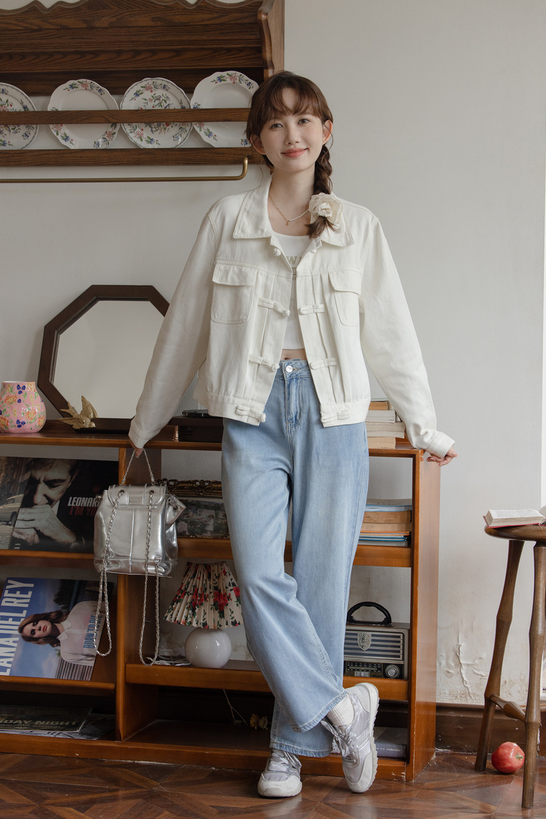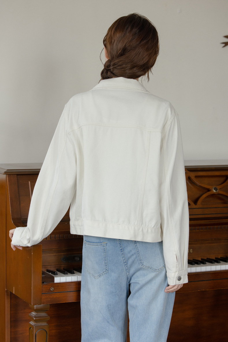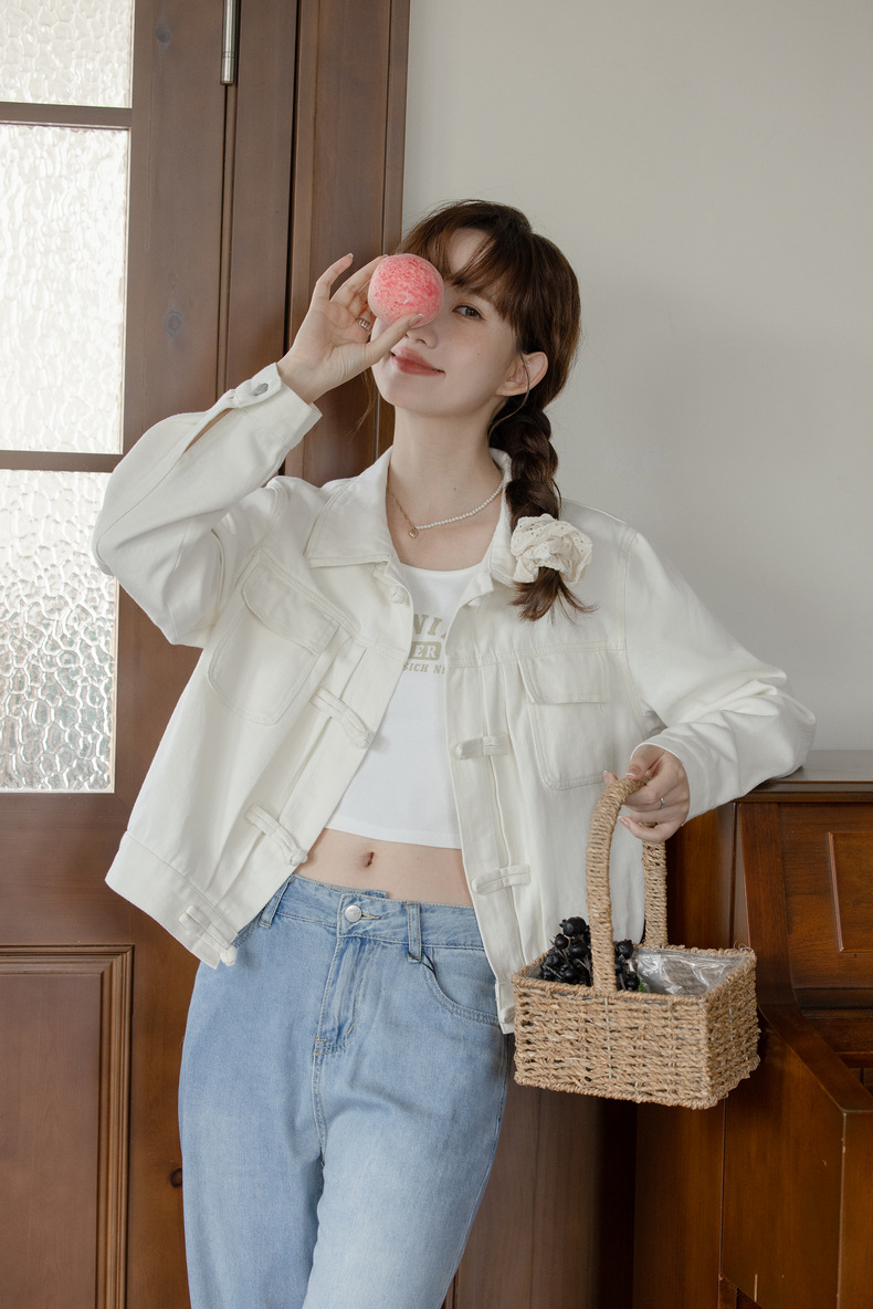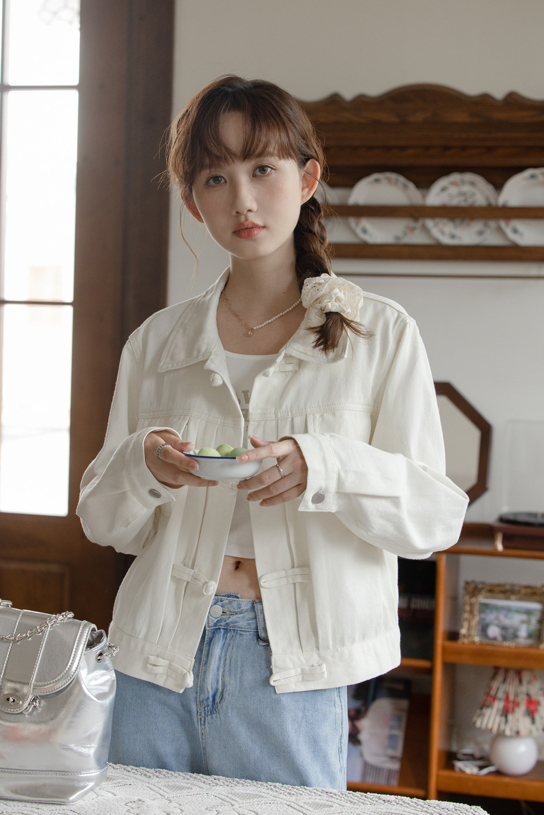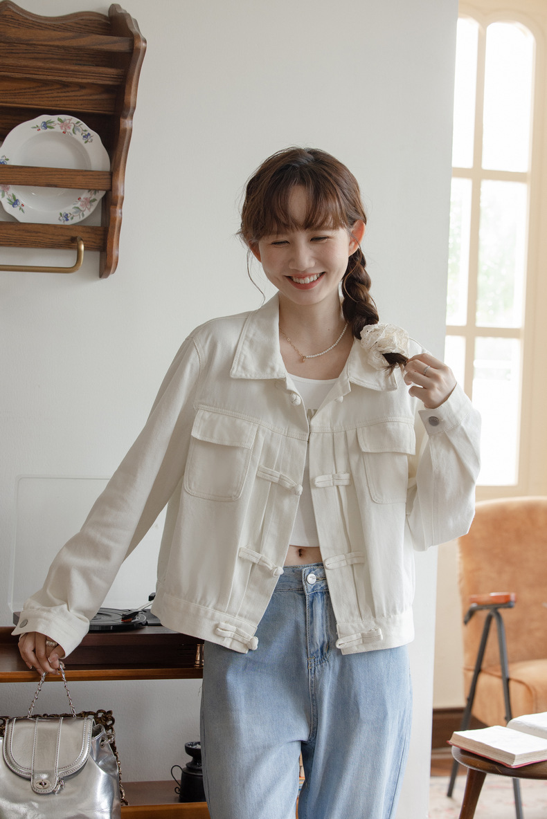 女士春秋盤口白色寬鬆短款牛仔外套