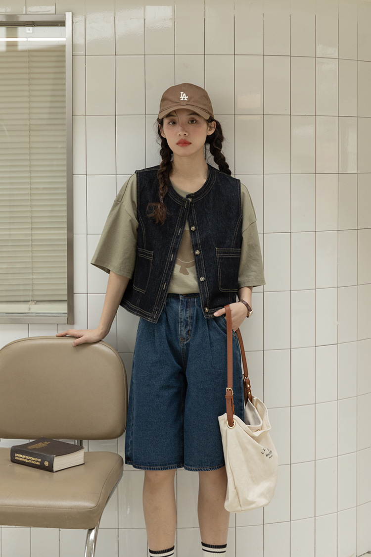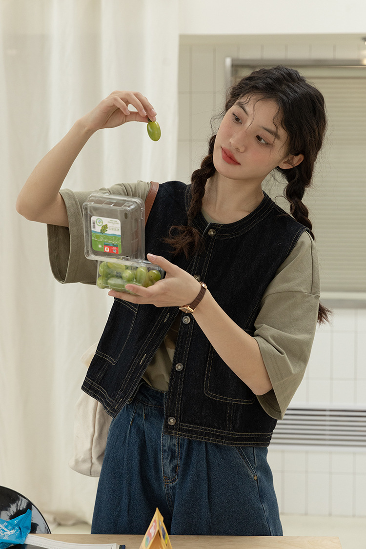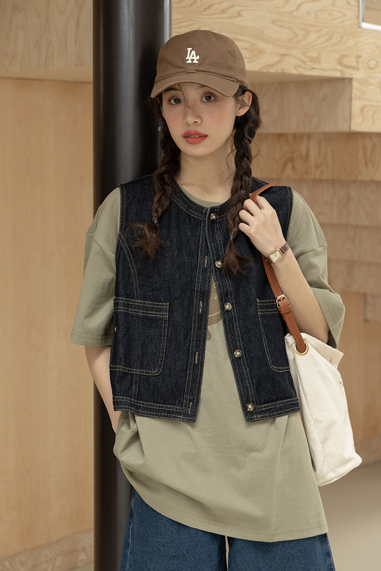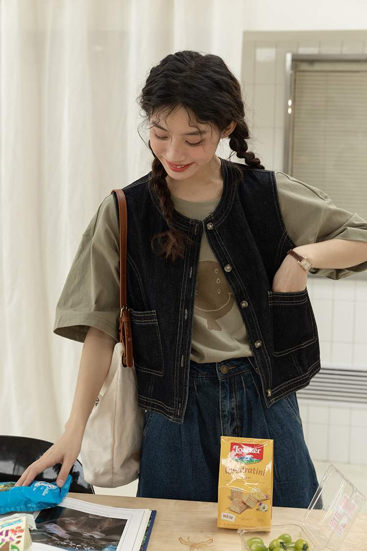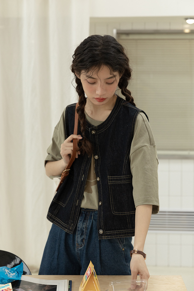 女士春秋短款明線設計牛仔馬甲