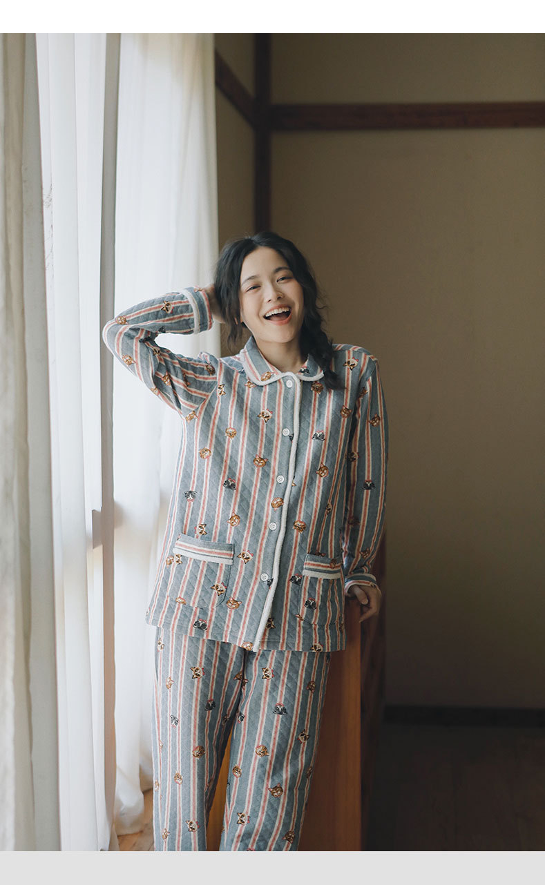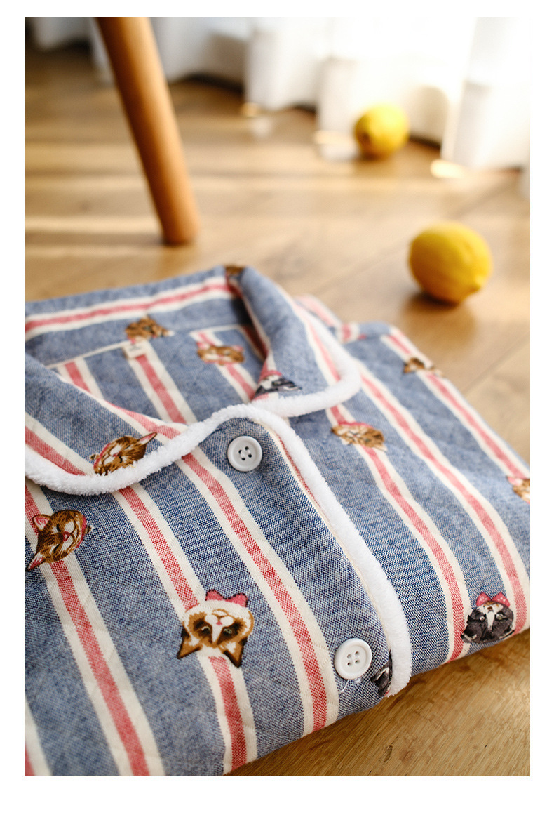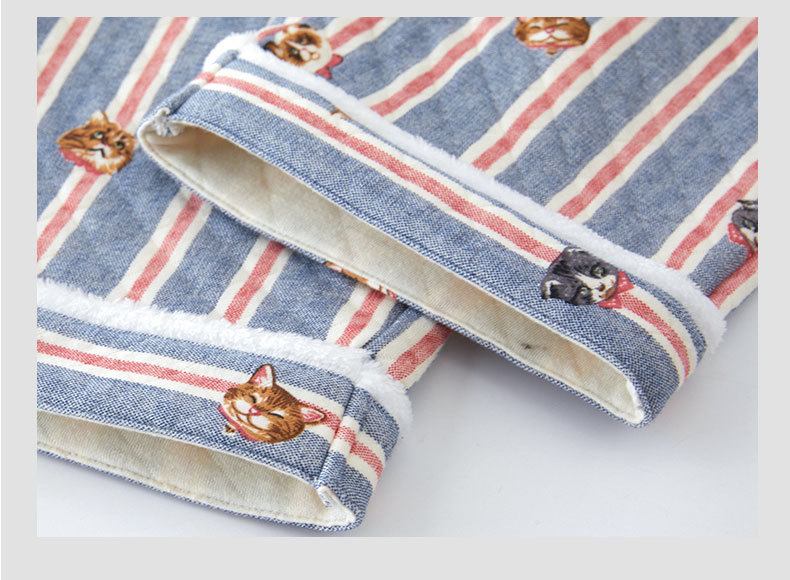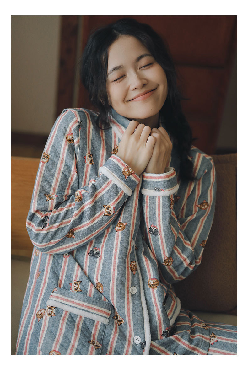 女士秋冬加厚空氣棉貓咪條紋長袖長褲居家服