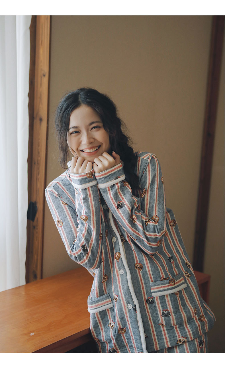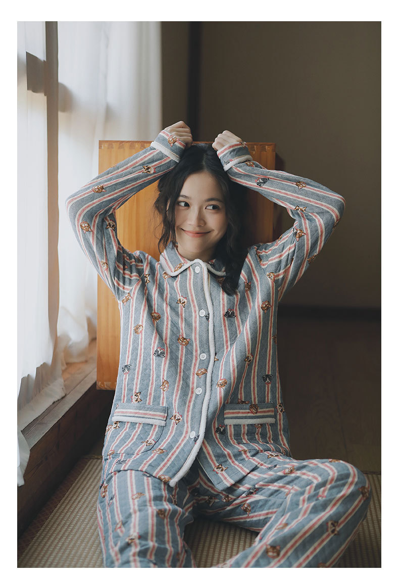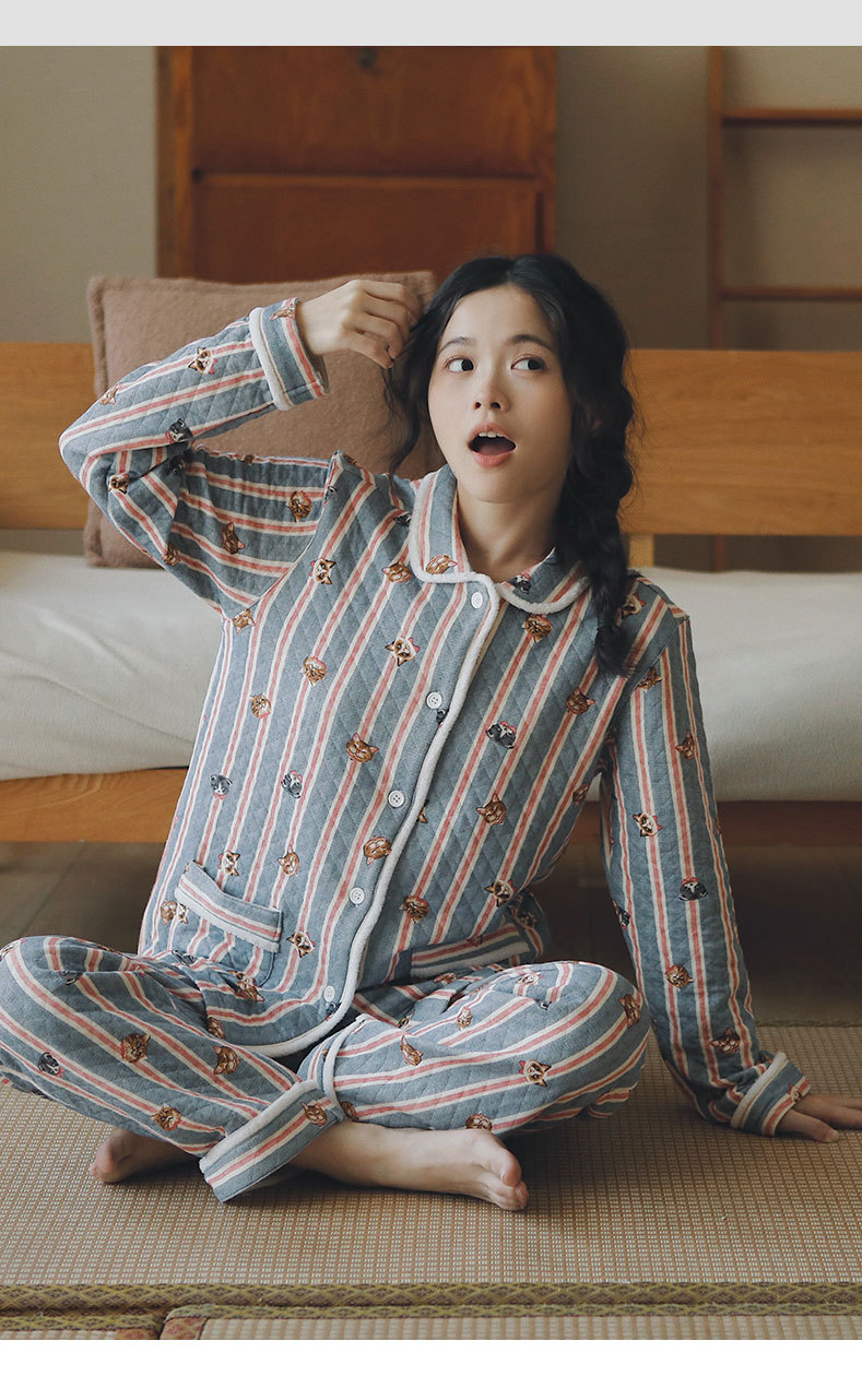 女士秋冬加厚空氣棉貓咪條紋長袖長褲居家服