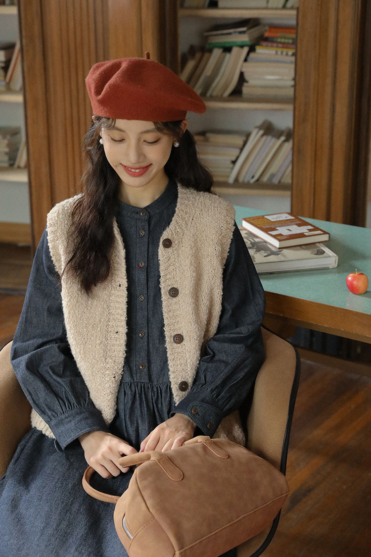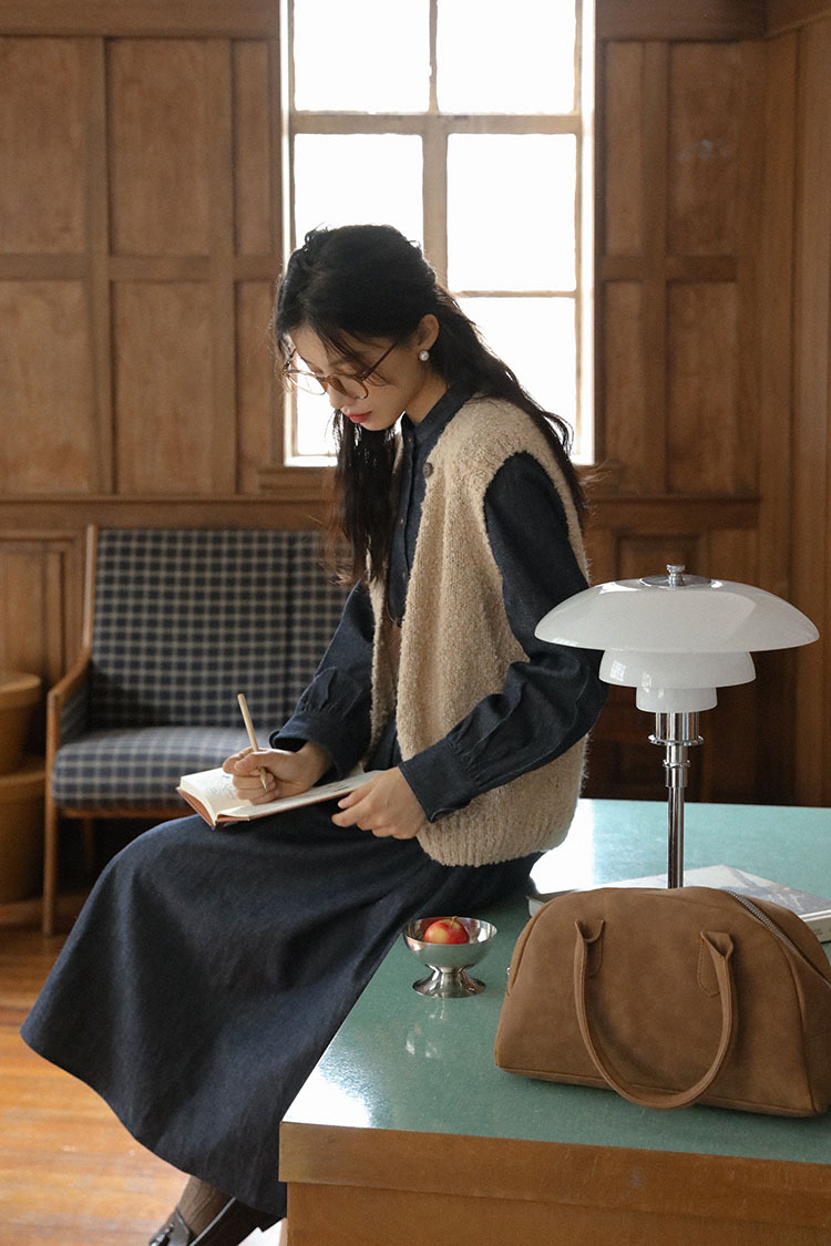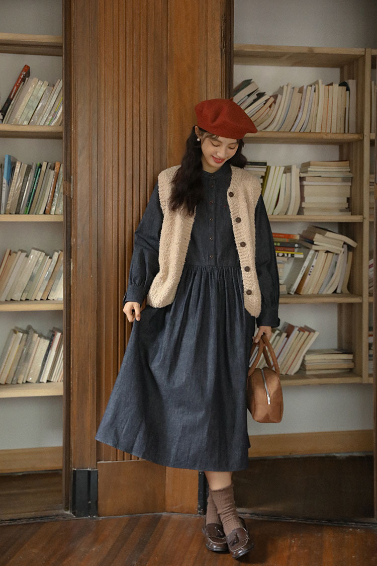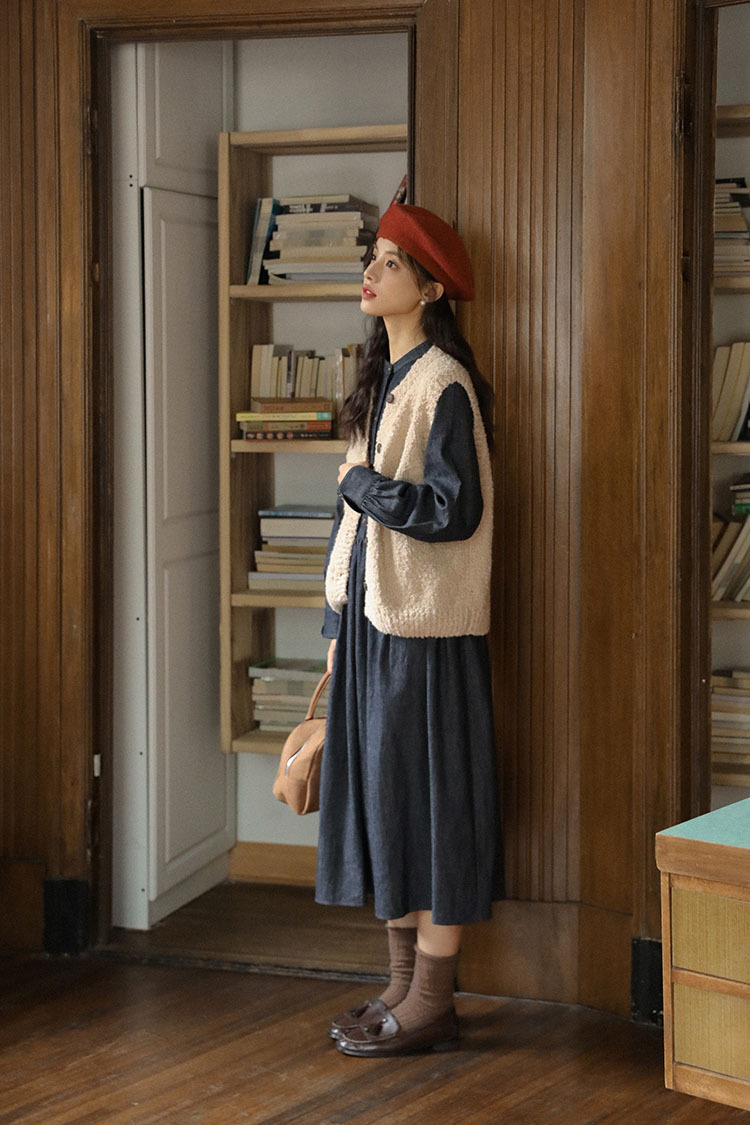 女士秋冬羊咩咩針織毛衣馬甲+長袖牛仔連衣裙
