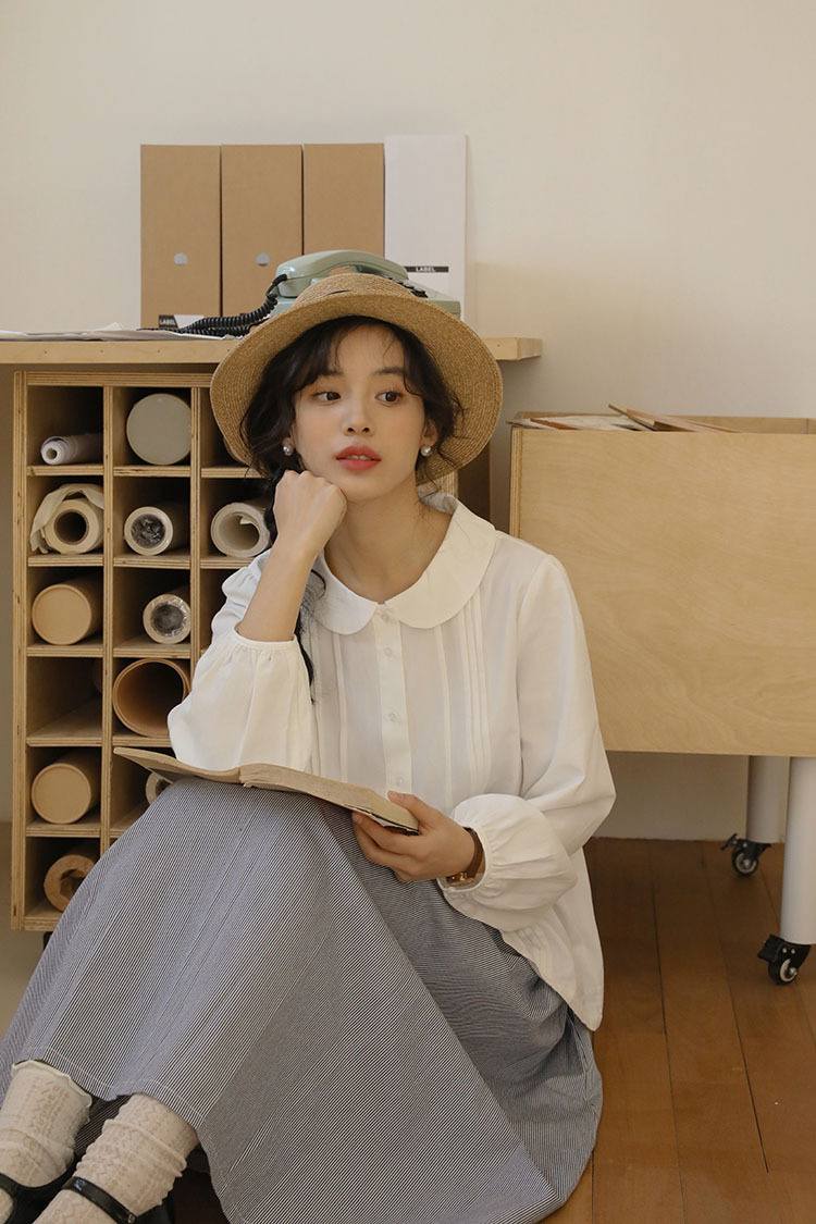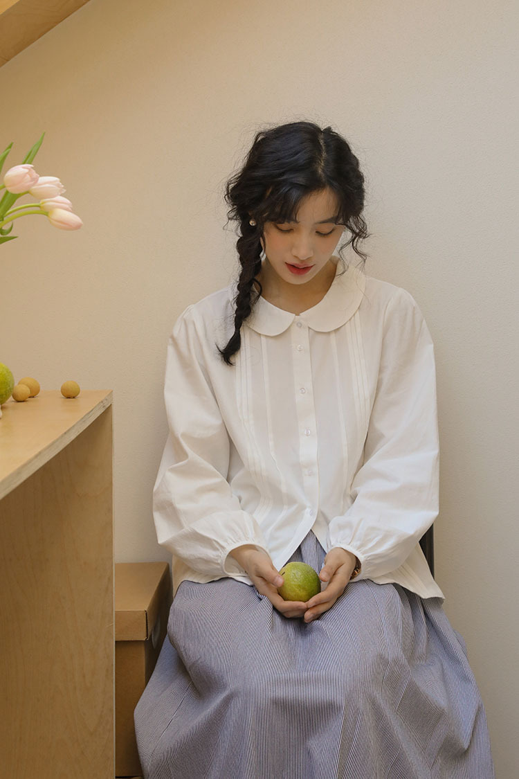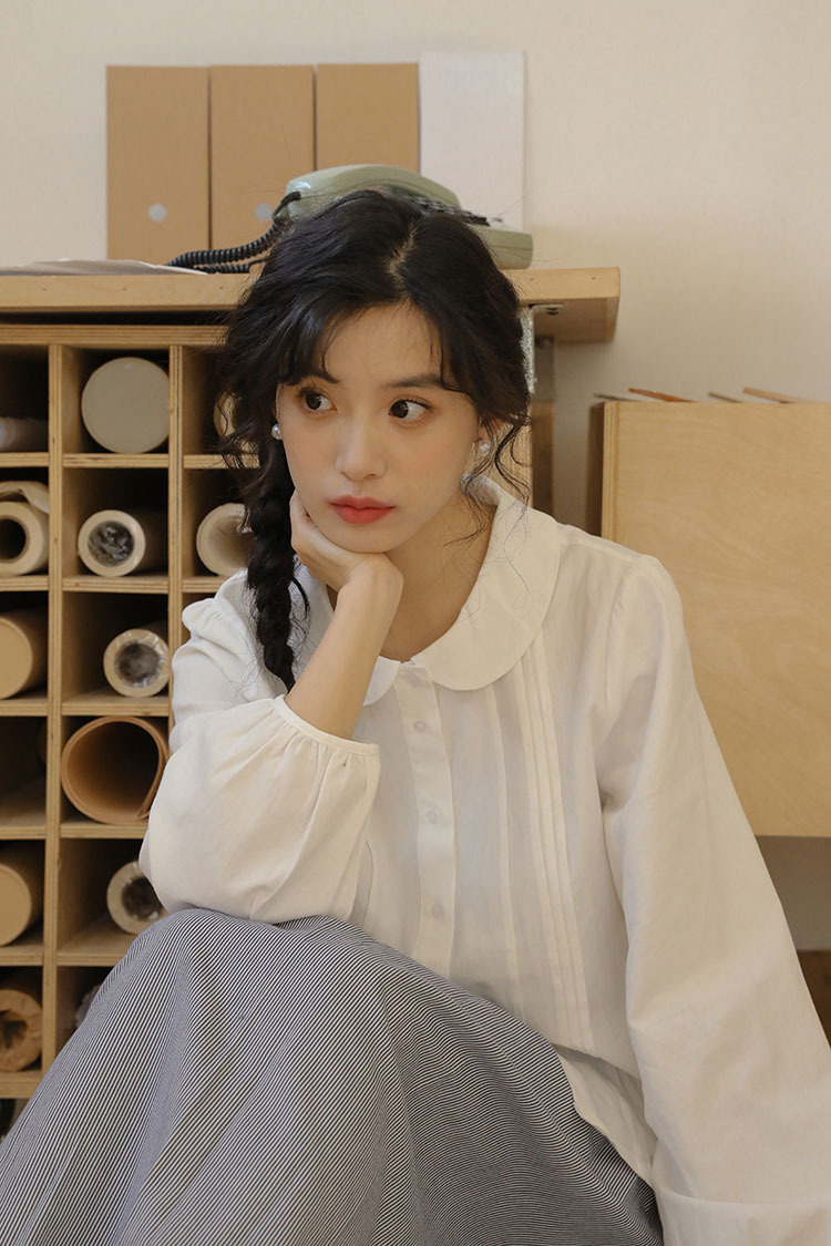 女士秋季日系娃娃領白襯衫+牛仔馬甲