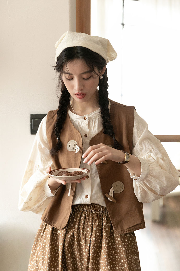 女士秋季森系圓領刺繡蕾絲長袖襯衫