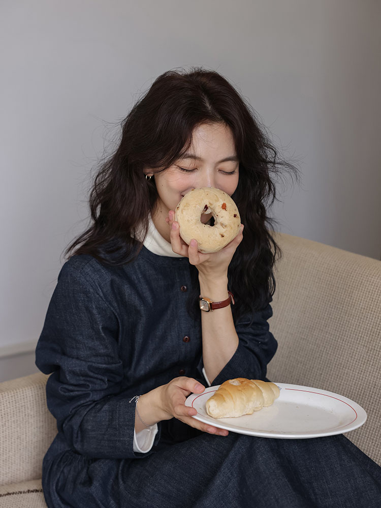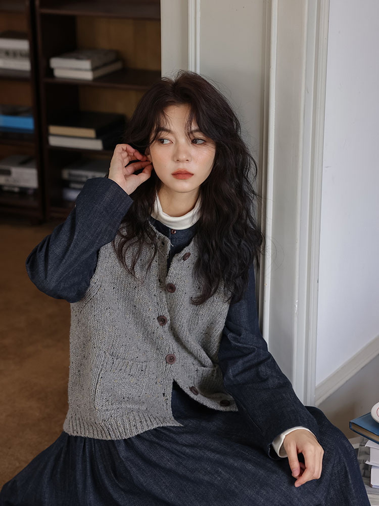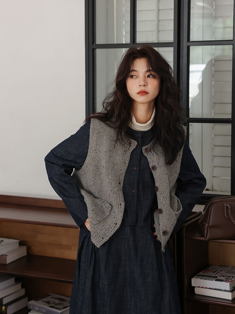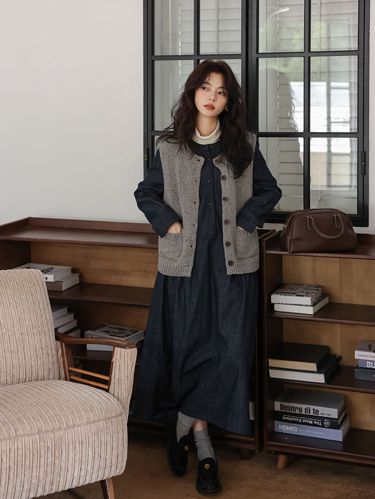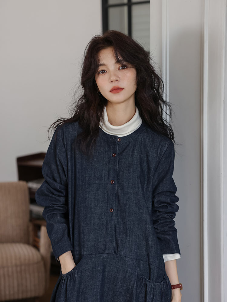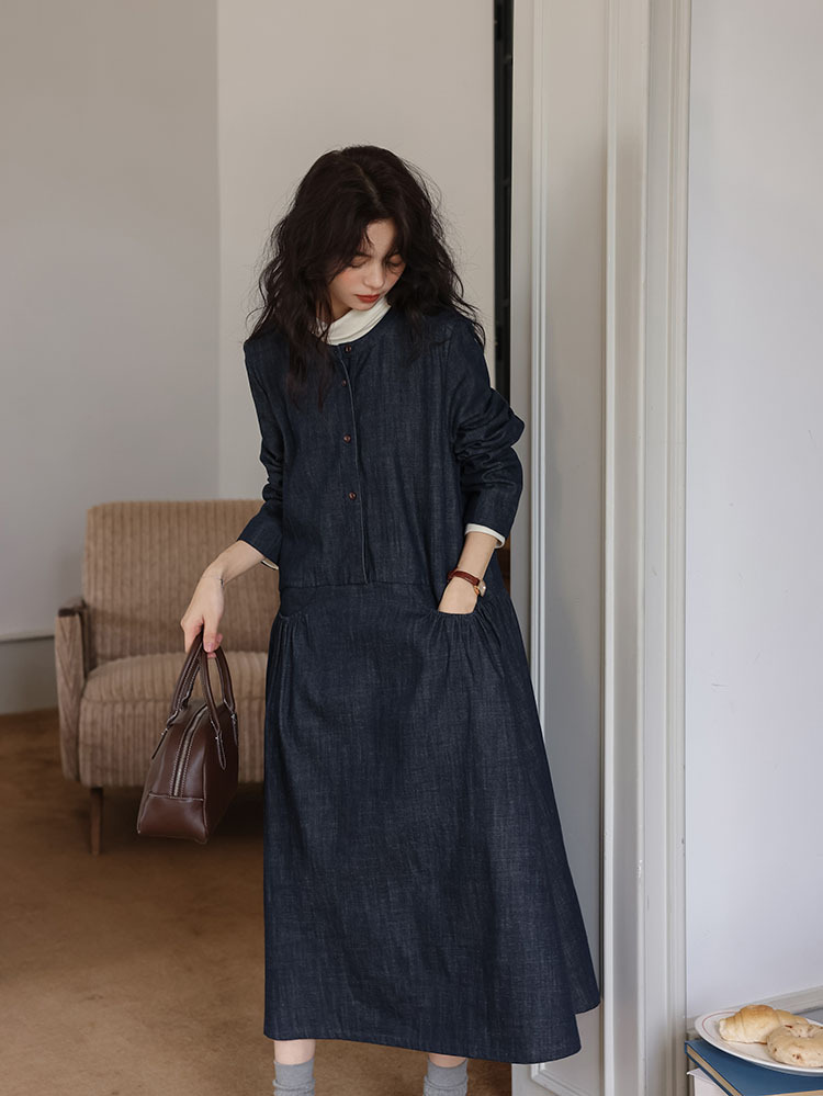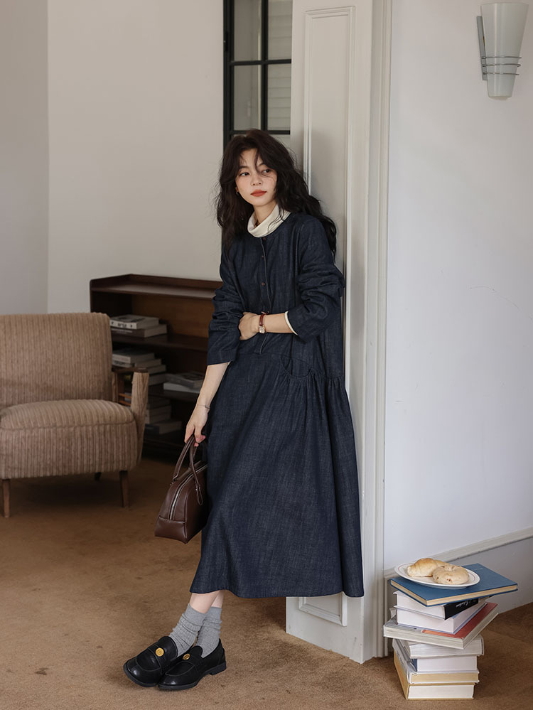 女士秋季森系圓領寬鬆牛仔連衣裙
