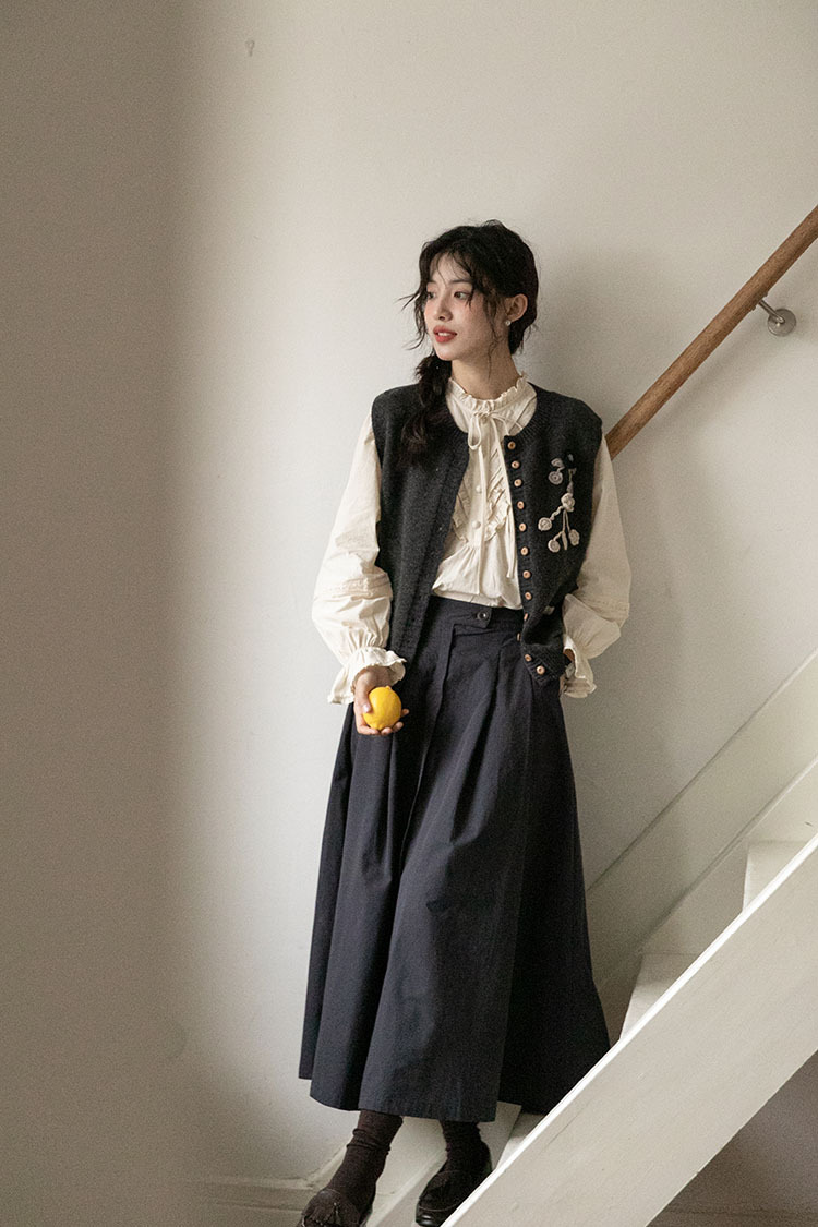 女士秋季法式高腰棉質藏藍色A字半身裙