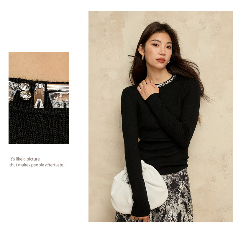 女士釘珠正肩純羊毛針織衫
