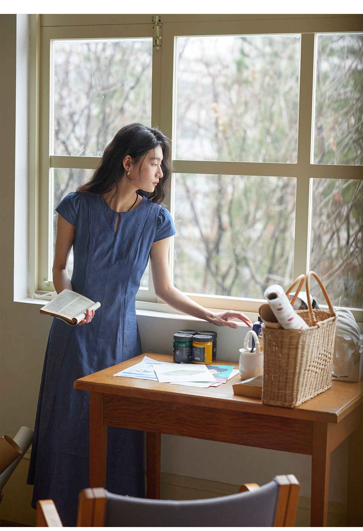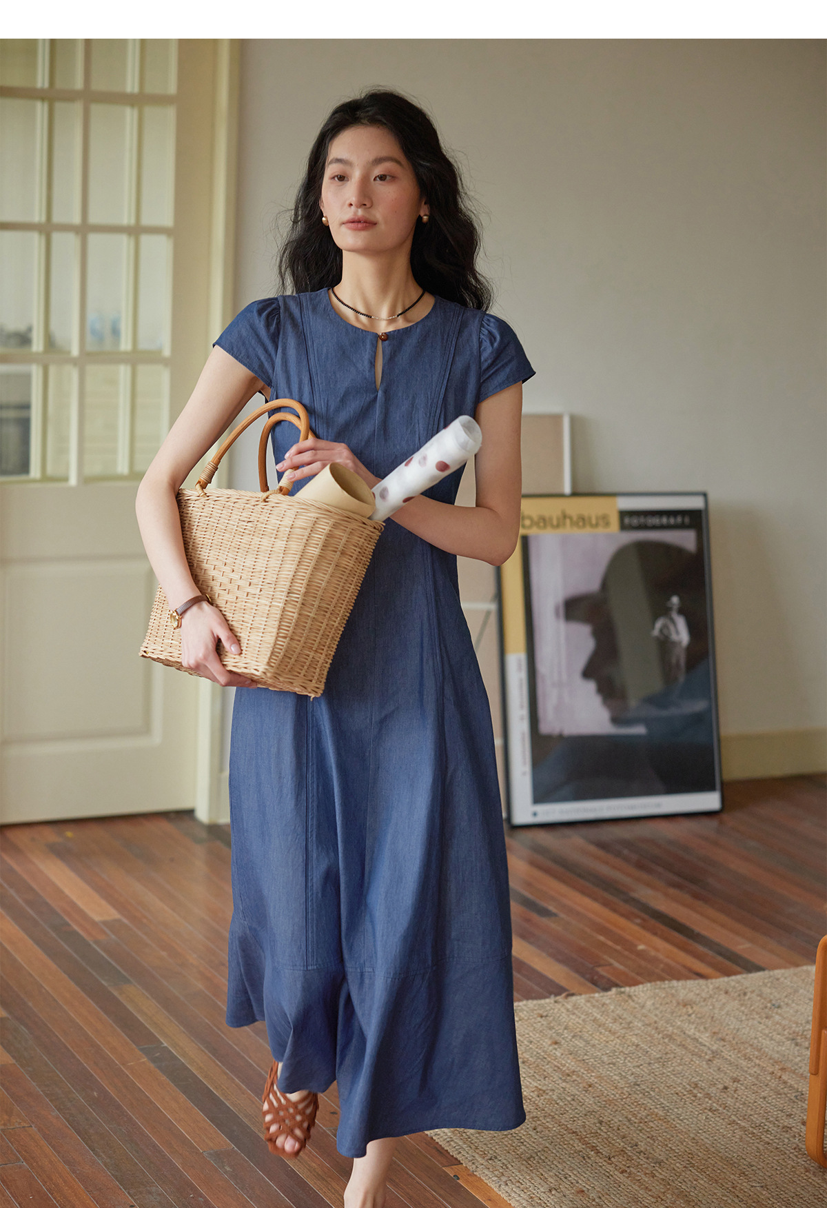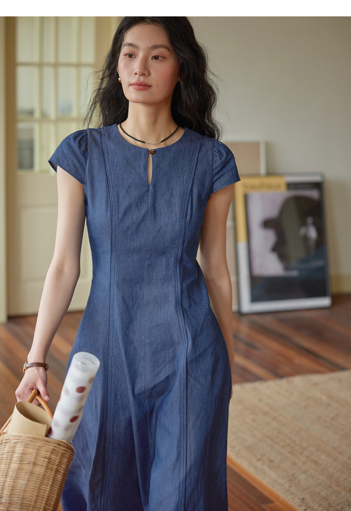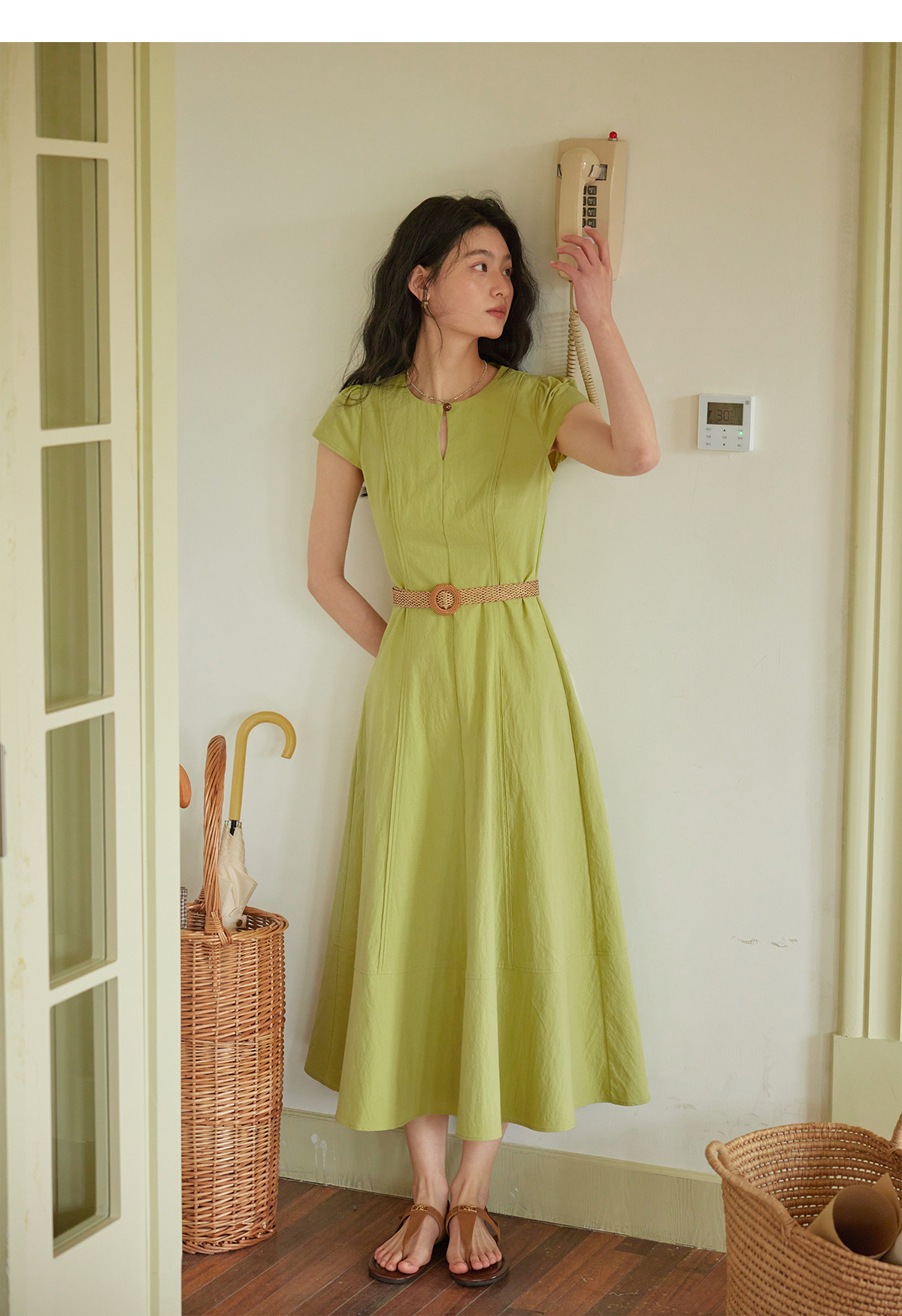女夏一粒扣圓領收腰連衣裙