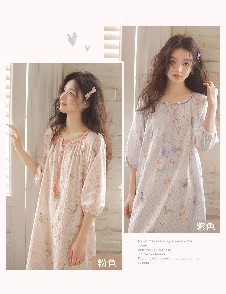 女款夏季棉紗流蘇系帶圓領七分袖睡裙