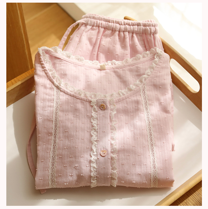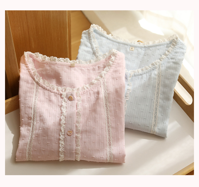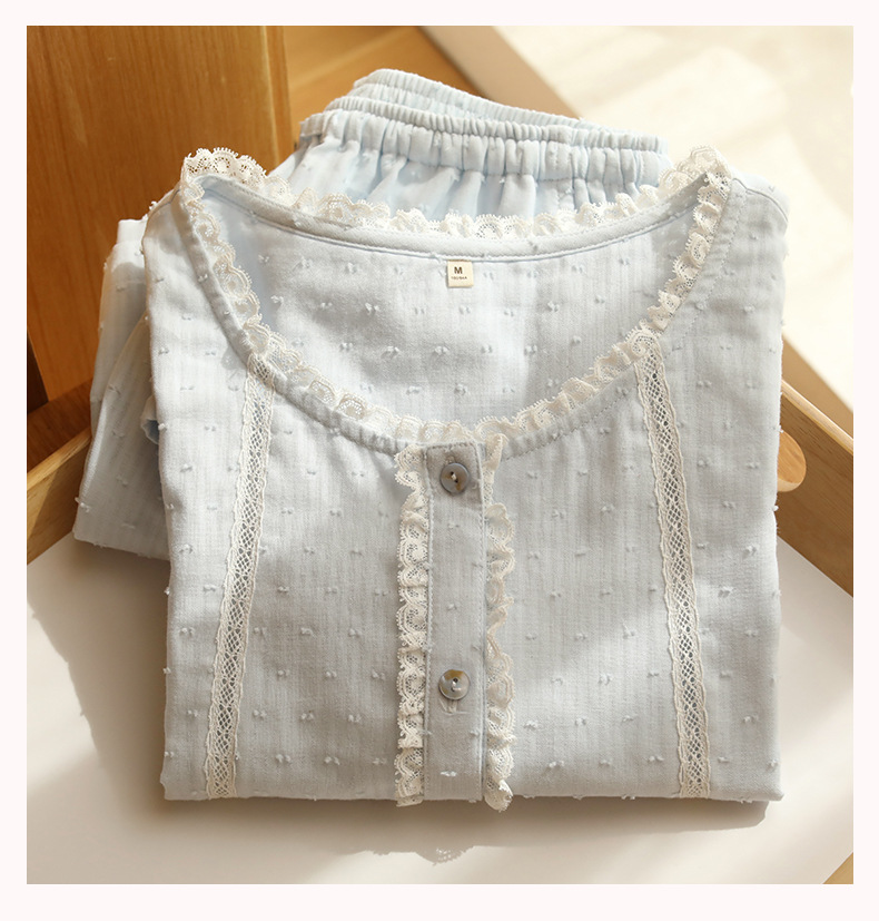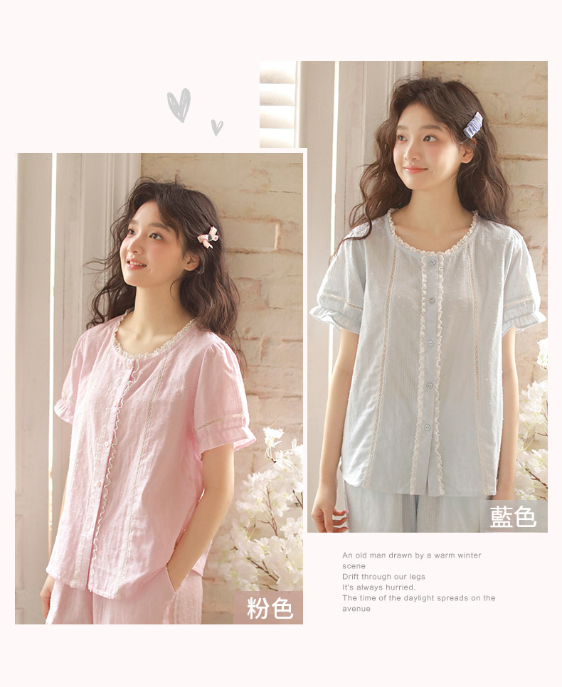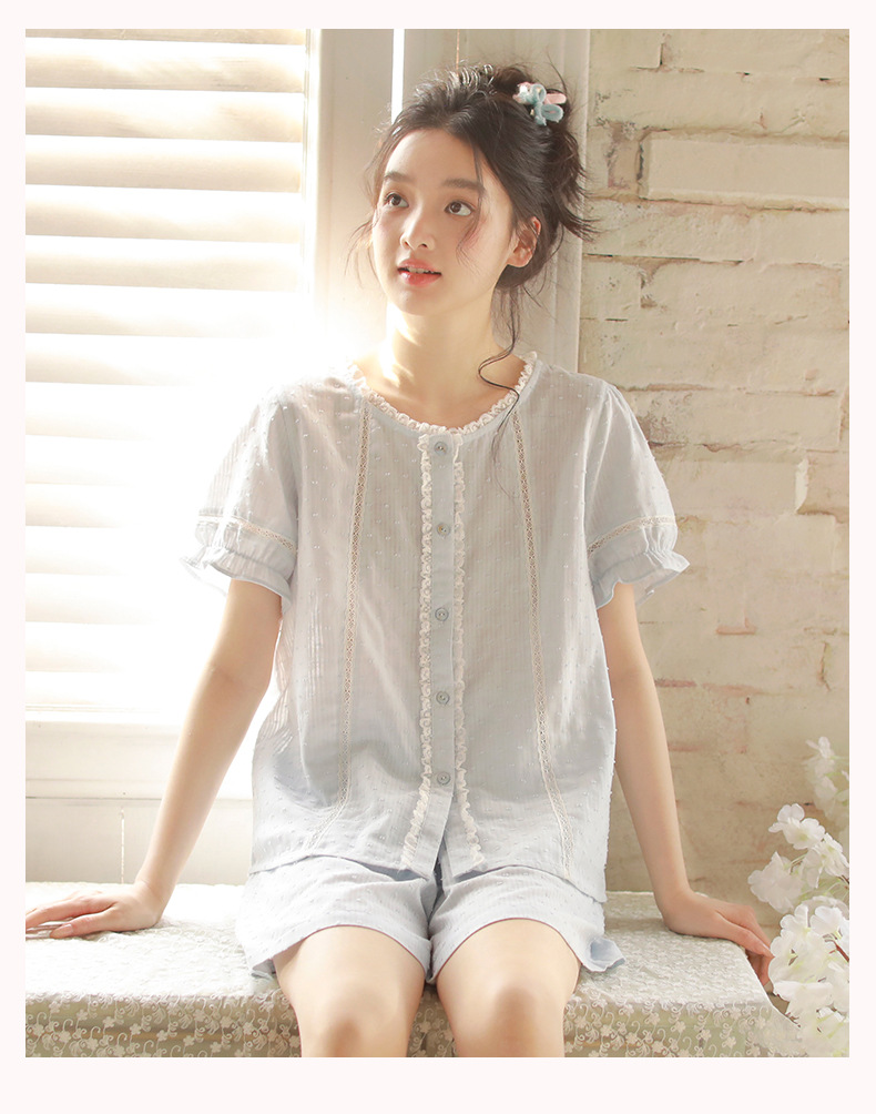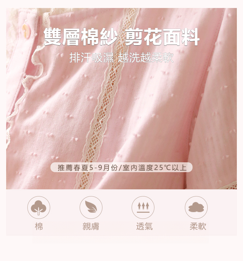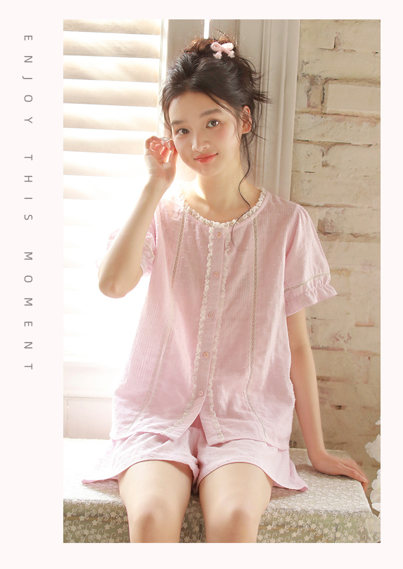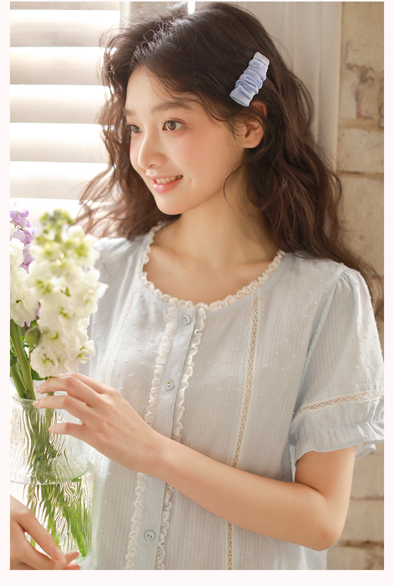 女款棉紗剪花蕾絲紐扣圓領短袖睡衣套裝