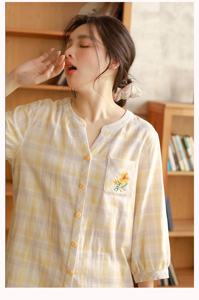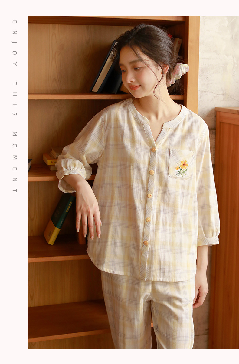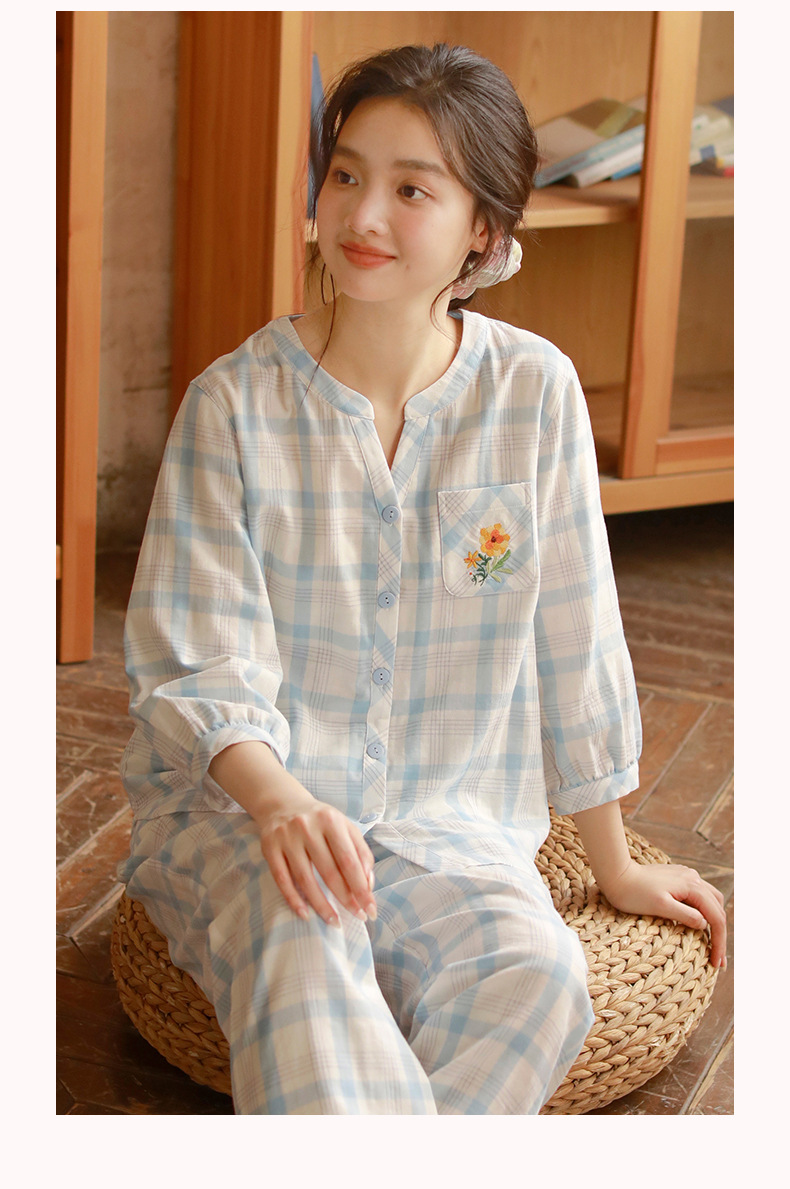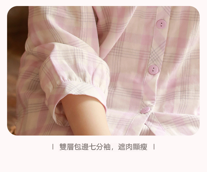 女款棉紗格紋V領七分袖長褲睡衣套裝